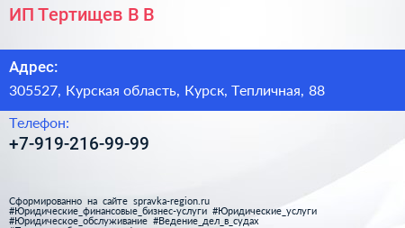 ИП Тертищев В.В. по адресу 305527, Курская область, Курск, Тепличная, 88 в дальнейшем Организация, размещена в следующих категориях: