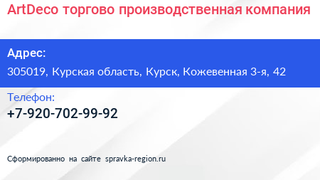 ArtDeco, торгово-производственная компания по адресу 305019, Курская область, Курск, Кожевенная 3-я, 42 в дальнейшем Организация, размещена в следующих категориях: