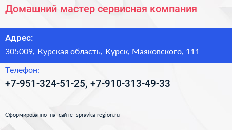 Домашний мастер, сервисная компания по адресу 305009, Курская область, Курск, Маяковского, 111 в дальнейшем Организация, размещена в следующих категориях: