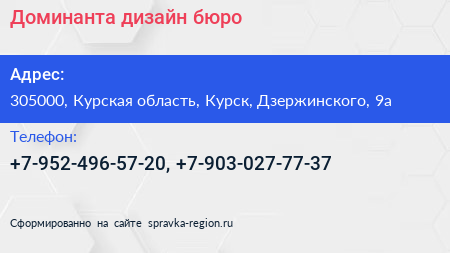 Доминанта, дизайн-бюро по адресу 305000, Курская область, Курск, Дзержинского, 9а в дальнейшем Организация, размещена в следующих категориях: