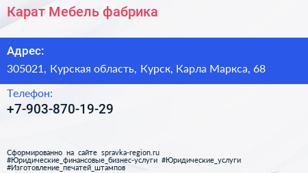 Карат-Мебель, фабрика по адресу 305021, Курская область, Курск, Карла Маркса, 68 в дальнейшем Организация, размещена в следующих категориях: