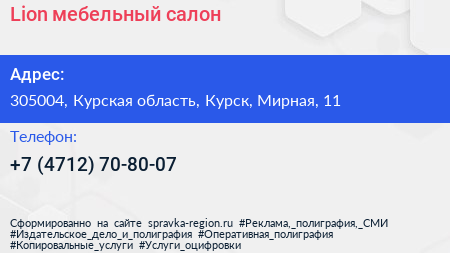 Lion, мебельный салон по адресу 305004, Курская область, Курск, Мирная, 11 в дальнейшем Организация, размещена в следующих категориях: