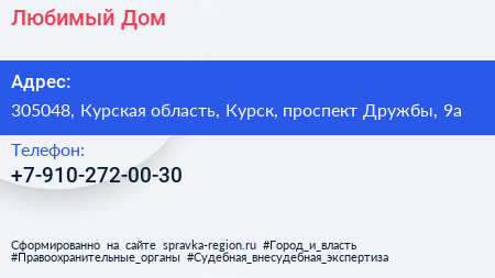 Любимый Дом по адресу 305048, Курская область, Курск, проспект Дружбы, 9а в дальнейшем Организация, размещена в следующих категориях: