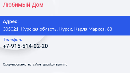 Любимый Дом по адресу 305021, Курская область, Курск, Карла Маркса, 68 в дальнейшем Организация, размещена в следующих категориях:
