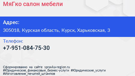 МяГко, салон мебели по адресу 305018, Курская область, Курск, Харьковская, 3 в дальнейшем Организация, размещена в следующих категориях:
