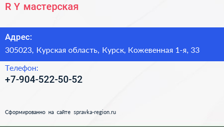 R+Y, мастерская по адресу 305023, Курская область, Курск, Кожевенная 1-я, 33 в дальнейшем Организация, размещена в следующих категориях:
