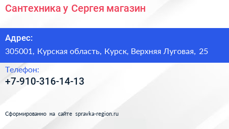 Сантехника у Сергея, магазин по адресу 305001, Курская область, Курск, Верхняя Луговая, 25 в дальнейшем Организация, размещена в следующих категориях: