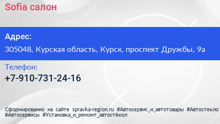 Sofia, салон по адресу 305048, Курская область, Курск, проспект Дружбы, 9а в дальнейшем Организация, размещена в следующих категориях: