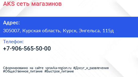 AKS, сеть магазинов по адресу 305007, Курская область, Курск, Энгельса, 115д в дальнейшем Организация, размещена в следующих категориях: