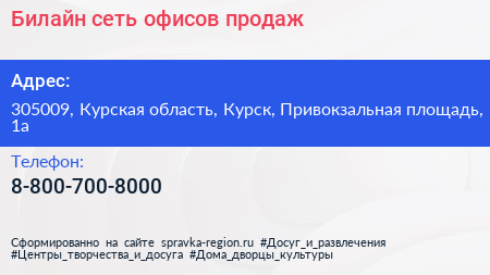 Билайн, сеть офисов продаж по адресу 305009, Курская область, Курск, Привокзальная площадь, 1а в дальнейшем Организация, размещена в следующих категориях:
