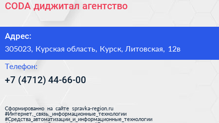 CODA, диджитал-агентство по адресу 305023, Курская область, Курск, Литовская, 12в в дальнейшем Организация, размещена в следующих категориях: