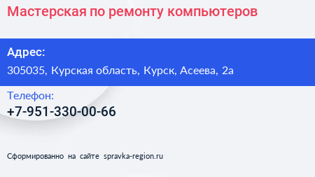 Мастерская по ремонту компьютеров по адресу 305035, Курская область, Курск, Асеева, 2а в дальнейшем Организация, размещена в следующих категориях: