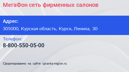 МегаФон, сеть фирменных салонов по адресу 305000, Курская область, Курск, Ленина, 30 в дальнейшем Организация, размещена в следующих категориях: