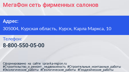 МегаФон, сеть фирменных салонов по адресу 305004, Курская область, Курск, Карла Маркса, 10 в дальнейшем Организация, размещена в следующих категориях:
