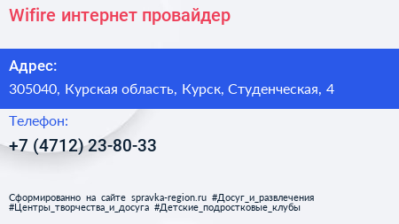 Wifire, интернет-провайдер по адресу 305040, Курская область, Курск, Студенческая, 4 в дальнейшем Организация, размещена в следующих категориях: