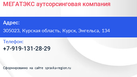 МЕГАТЭКС, аутсорсинговая компания по адресу 305023, Курская область, Курск, Энгельса, 134 в дальнейшем Организация, размещена в следующих категориях: