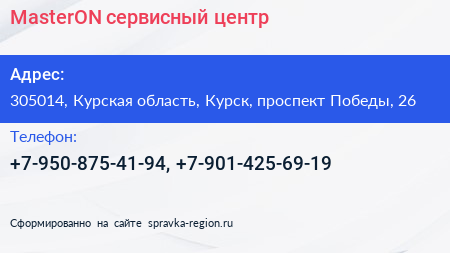 MasterON, сервисный центр по адресу 305014, Курская область, Курск, проспект Победы, 26 в дальнейшем Организация, размещена в следующих категориях: