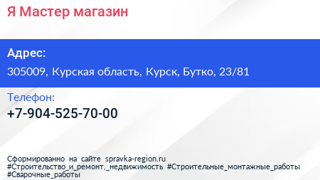 Я-Мастер, магазин по адресу 305009, Курская область, Курск, Бутко, 23/81 в дальнейшем Организация, размещена в следующих категориях: