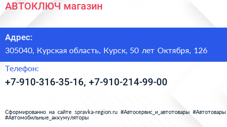 АВТОКЛЮЧ, магазин по адресу 305040, Курская область, Курск, 50 лет Октября, 126 в дальнейшем Организация, размещена в следующих категориях: