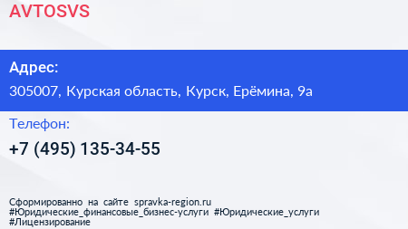 AVTOSVS по адресу 305007, Курская область, Курск, Ерёмина, 9а в дальнейшем Организация, размещена в следующих категориях: