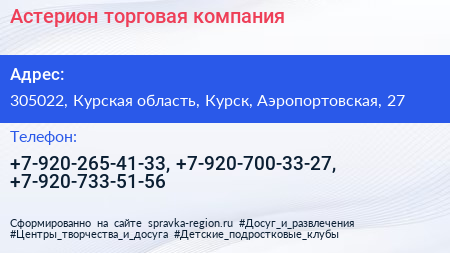 Астерион, торговая компания по адресу 305022, Курская область, Курск, Аэропортовская, 27 в дальнейшем Организация, размещена в следующих категориях: