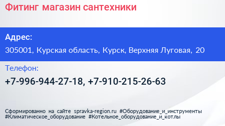 Фитинг, магазин сантехники по адресу 305001, Курская область, Курск, Верхняя Луговая, 20 в дальнейшем Организация, размещена в следующих категориях:
