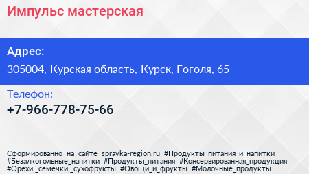 Импульс, мастерская по адресу 305004, Курская область, Курск, Гоголя, 65 в дальнейшем Организация, размещена в следующих категориях:
