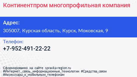 Континентпром, многопрофильная компания по адресу 305007, Курская область, Курск, Моковская, 9 в дальнейшем Организация, размещена в следующих категориях: