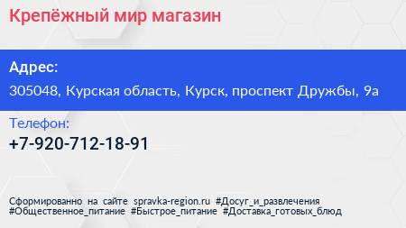 Крепёжный мир, магазин по адресу 305048, Курская область, Курск, проспект Дружбы, 9а в дальнейшем Организация, размещена в следующих категориях: