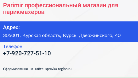 Parimir, профессиональный магазин для парикмахеров по адресу 305001, Курская область, Курск, Дзержинского, 40 в дальнейшем Организация, размещена в следующих категориях: