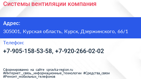 Системы вентиляции, компания по адресу 305001, Курская область, Курск, Дзержинского, 66/1 в дальнейшем Организация, размещена в следующих категориях: