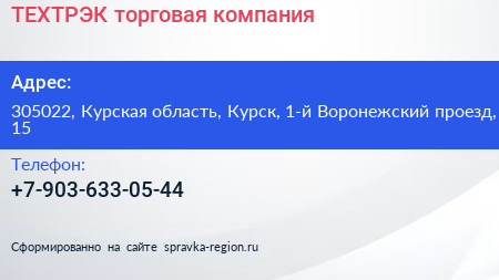 ТЕХТРЭК, торговая компания по адресу 305022, Курская область, Курск, 1-й Воронежский проезд, 15 в дальнейшем Организация, размещена в следующих категориях: