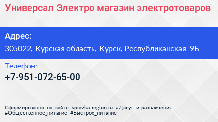 Универсал-Электро, магазин электротоваров по адресу 305022, Курская область, Курск, Республиканская, 9Б в дальнейшем Организация, размещена в следующих категориях: