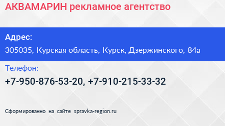 АКВАМАРИН, рекламное агентство по адресу 305035, Курская область, Курск, Дзержинского, 84а в дальнейшем Организация, размещена в следующих категориях: