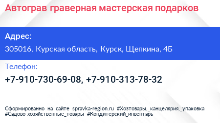 Автограв, граверная мастерская подарков по адресу 305016, Курская область, Курск, Щепкина, 4Б в дальнейшем Организация, размещена в следующих категориях: