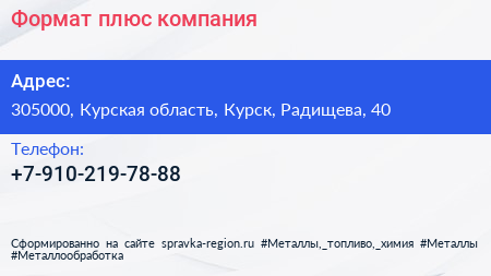 Формат плюс, компания по адресу 305000, Курская область, Курск, Радищева, 40 в дальнейшем Организация, размещена в следующих категориях: