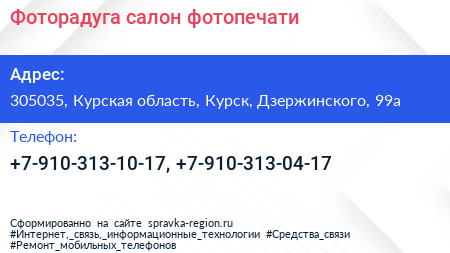 Фоторадуга, салон фотопечати по адресу 305035, Курская область, Курск, Дзержинского, 99а в дальнейшем Организация, размещена в следующих категориях: