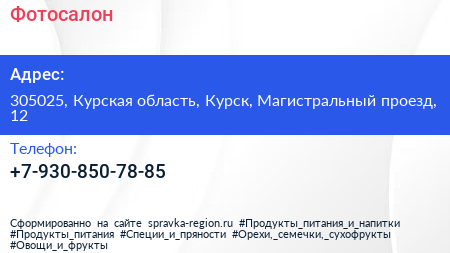 Фотосалон по адресу 305025, Курская область, Курск, Магистральный проезд, 12 в дальнейшем Организация, размещена в следующих категориях: