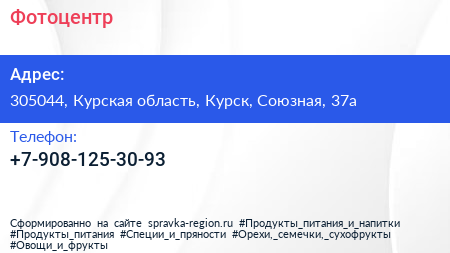 Фотоцентр по адресу 305044, Курская область, Курск, Союзная, 37а в дальнейшем Организация, размещена в следующих категориях: