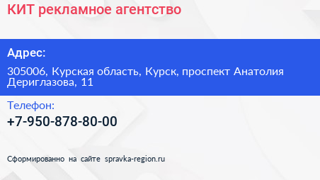 КИТ, рекламное агентство по адресу 305006, Курская область, Курск, проспект Анатолия Дериглазова, 11 в дальнейшем Организация, размещена в следующих категориях: