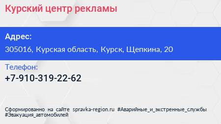 Курский центр рекламы по адресу 305016, Курская область, Курск, Щепкина, 20 в дальнейшем Организация, размещена в следующих категориях: