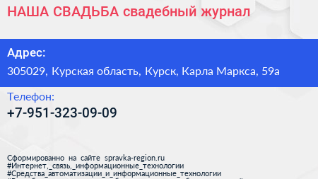 НАША СВАДЬБА, свадебный журнал по адресу 305029, Курская область, Курск, Карла Маркса, 59а в дальнейшем Организация, размещена в следующих категориях: