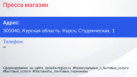 Пресса, магазин по адресу 305040, Курская область, Курск, Студенческая, 1 в дальнейшем Организация, размещена в следующих категориях: