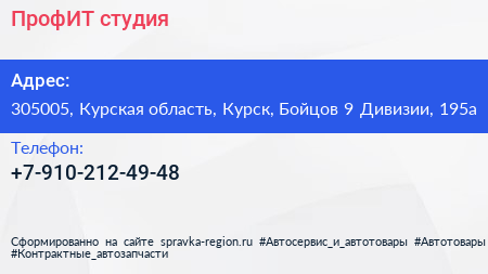 ПрофИТ, студия по адресу 305005, Курская область, Курск, Бойцов 9 Дивизии, 195а в дальнейшем Организация, размещена в следующих категориях: