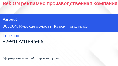 ReklON, рекламно-производственная компания по адресу 305004, Курская область, Курск, Гоголя, 65 в дальнейшем Организация, размещена в следующих категориях: