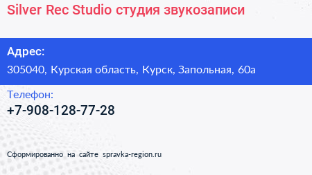 Silver Rec Studio, студия звукозаписи по адресу 305040, Курская область, Курск, Запольная, 60а в дальнейшем Организация, размещена в следующих категориях: