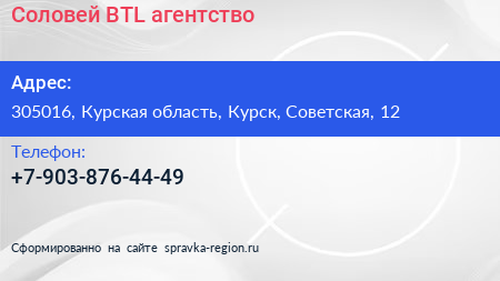 Соловей, BTL-агентство по адресу 305016, Курская область, Курск, Советская, 12 в дальнейшем Организация, размещена в следующих категориях: