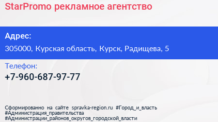 StarPromo, рекламное агентство по адресу 305000, Курская область, Курск, Радищева, 5 в дальнейшем Организация, размещена в следующих категориях: