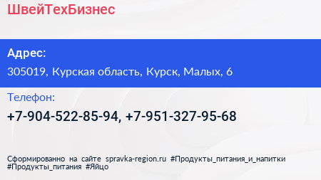 ШвейТехБизнес по адресу 305019, Курская область, Курск, Малых, 6 в дальнейшем Организация, размещена в следующих категориях: