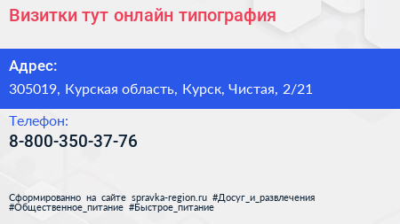 Визитки тут, онлайн-типография по адресу 305019, Курская область, Курск, Чистая, 2/21 в дальнейшем Организация, размещена в следующих категориях: